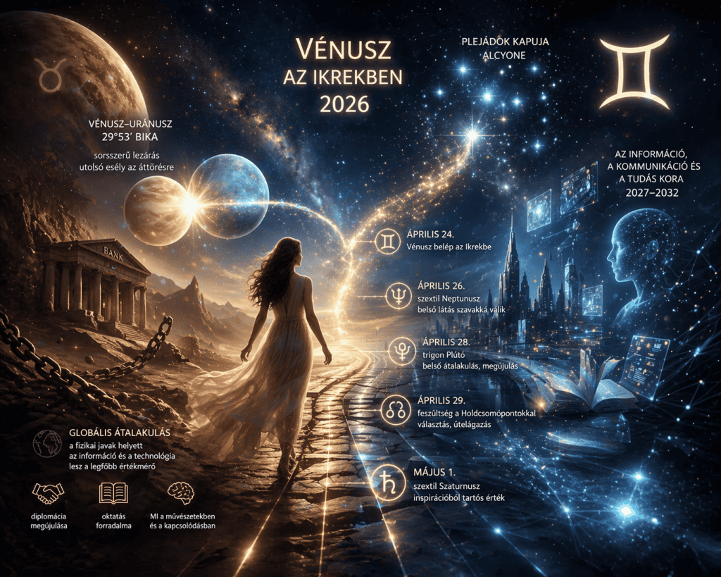 Sorsszerű lezárások és a szellemi korszak hajnala A szeretet, a szépség és az értékek bolygója, a Vénusz 2026. április 24-én lép át az intellektuális Ikrek jegyébe, ám az idei jegyváltás is különlegesen zajlik. Közvetlenül mielőtt elhagyná a Bika jegyét, annak utolsó fokán – az úgynevezett anaretikus vagy sorsdöntő fokon (29°53’) – a Vénusz pontosan ott […]