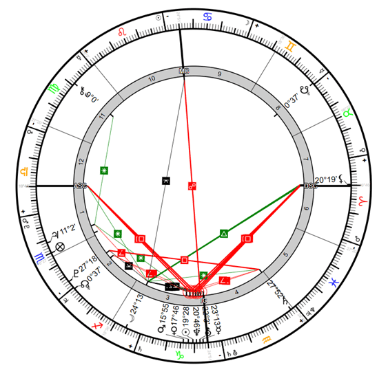 (Zárójelben: a Bak stellium és a Rák Jupiter tranzit helyzete a horoszkópházakban)