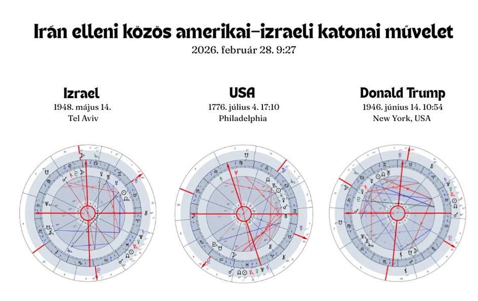 Donald Trump (Mars Oroszlán 26°) és Izrael (Mars Oroszlán 28°) születési képlete szoros együttállást alkot, ami egyfajta szimbiózist jelez a katonai stratégiákban, nyíltan rezsimváltásra buzdítva az iráni népet – egy olyan lépés ez, amely az Oroszlán jegyében álló Mars-dominanciát tükrözi. Lényegében a februári Napfogyatkozás fokára érkező Mars olyan láncreakciót indított el, amelyben a Trump és Izrael képletében lévő Mars-konstellációk közös célpontként jelölték ki Iránt, így a Szaturnusz–Neptunusz együttállás bomlasztó energiája hirtelen, agresszív katonai beavatkozás formájában manifesztálódott.